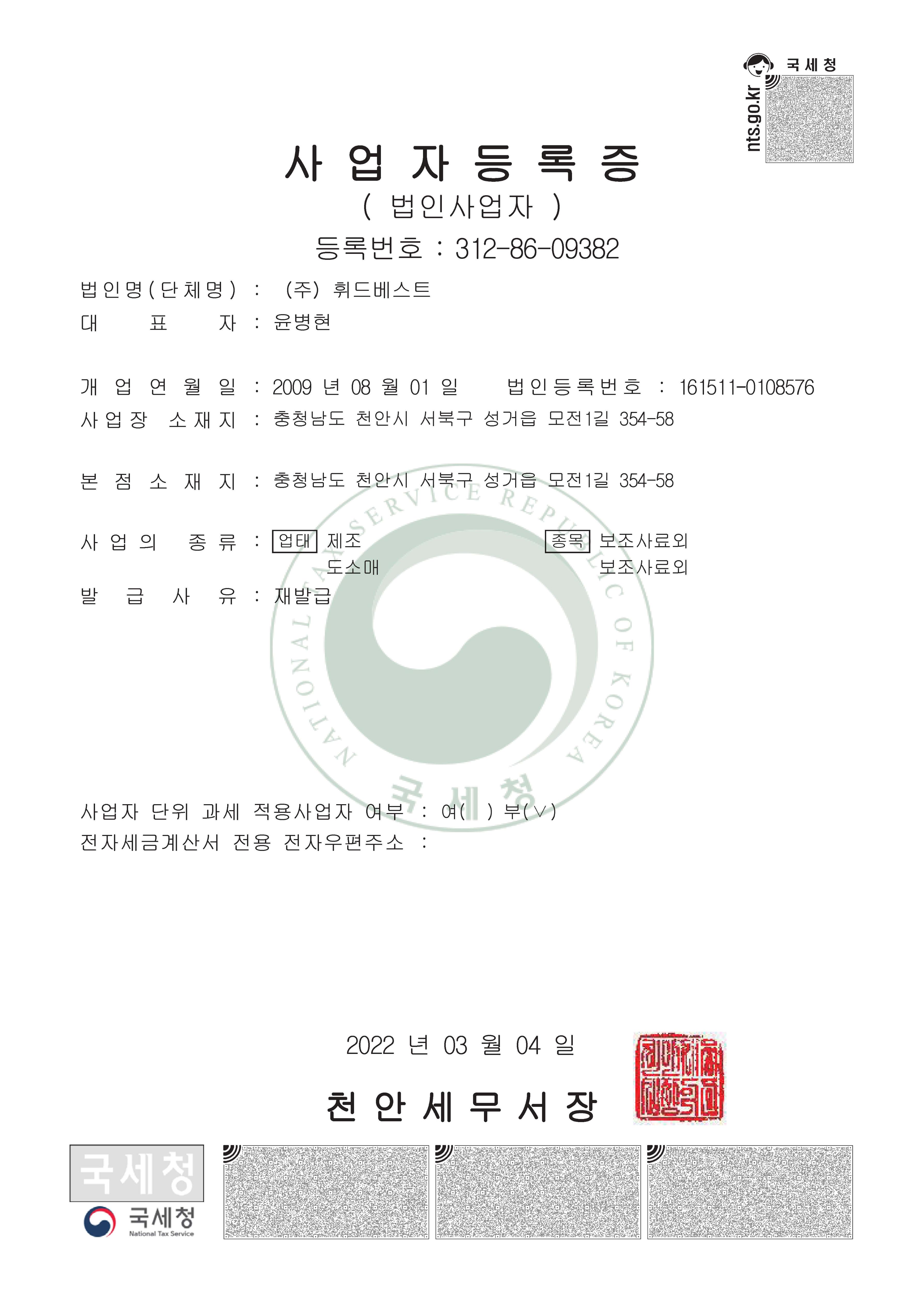 충남 천안시 서북구 성거읍 모전1길 354-58 (주)휘드베스트(우:31042)